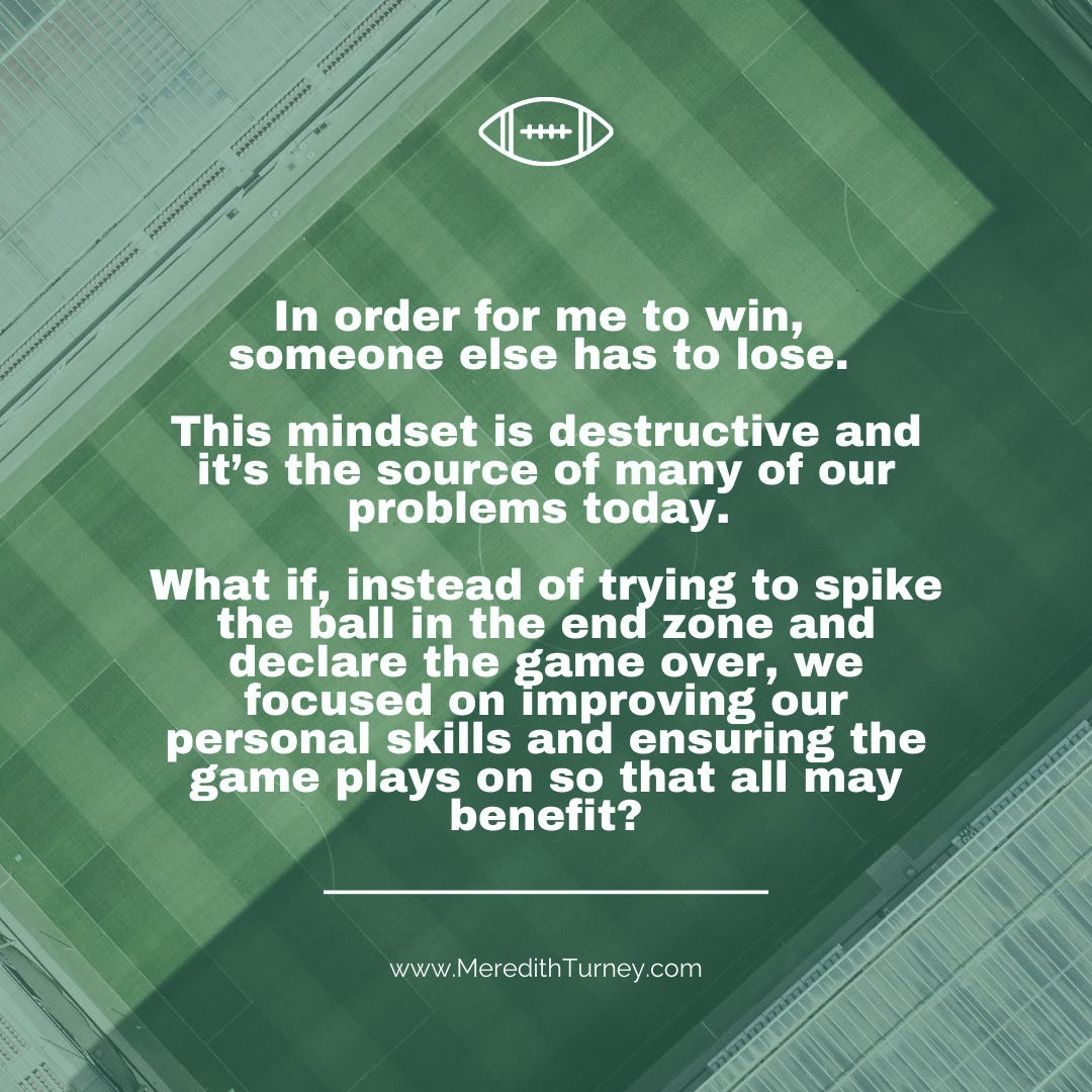 In order for me to win, someone else has to lose. This mindset is destructive and it’s the source of many of our problems today. What if, instead of trying to spike the ball in the end zone and declare the game over, we focused on improving our personal skills and ensuring the game plays on so that all may benefit?