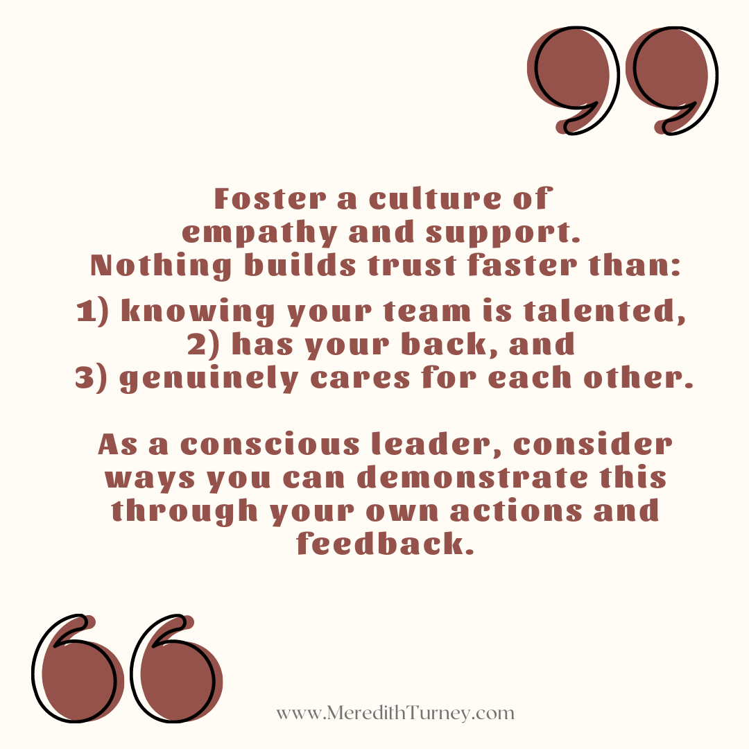 Third, foster a culture of empathy and support. Nothing builds trust faster than 1) knowing your team is talented, 2) has your back, and 3) genuinely cares for each other. As a conscious leader, consider ways you can demonstrate this through your own actions and feedback. Are you showing empathy? Do you strongly support your team? Do you show how you care for your team?