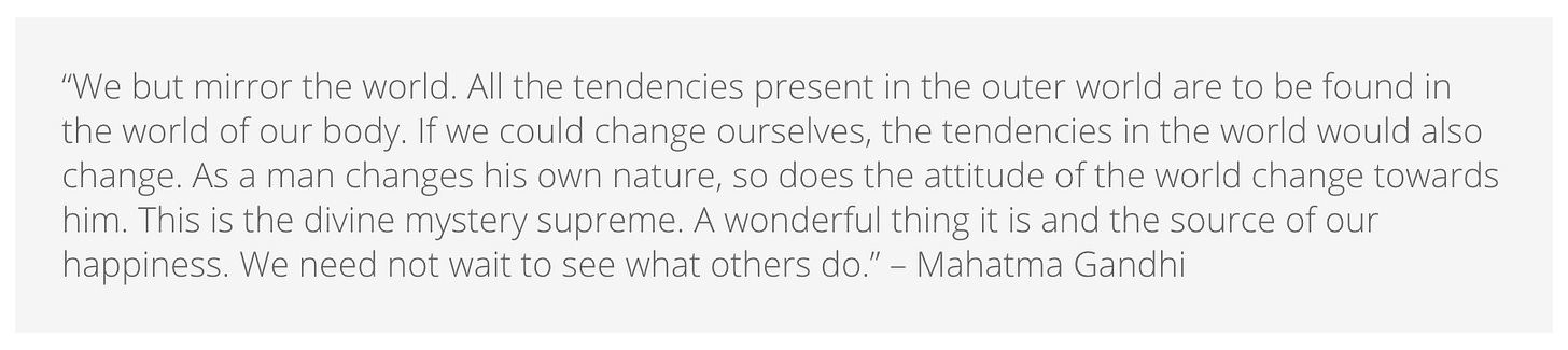 One of my life mantras is Mahatma Gandhi’s quote, “BE the change that you want to see in the world.” The way I interpret this wisdom is that if I want to see more peace, love, kindness, compassion, etc., then I need to develop those qualities in my own life. If each of us committed to this work, can you imagine how the world would transform? Instead of pointing fingers and finding fault with others, we would recognize we must first examine our own motivations and actions.