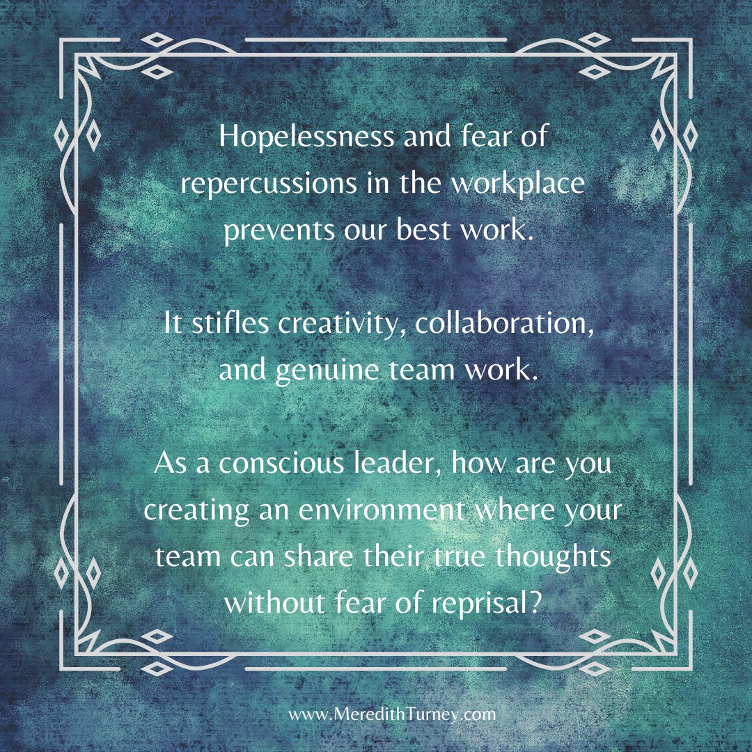 But hopelessness and fear of repercussions in the workplace prevents our best work. It stifles creativity, collaboration, and genuine team work. Psychological safety is an essential attribute of the strongest teams and their members. As a conscious leader, how are you creating an environment where your team can share their true thoughts without fear of reprisal?
