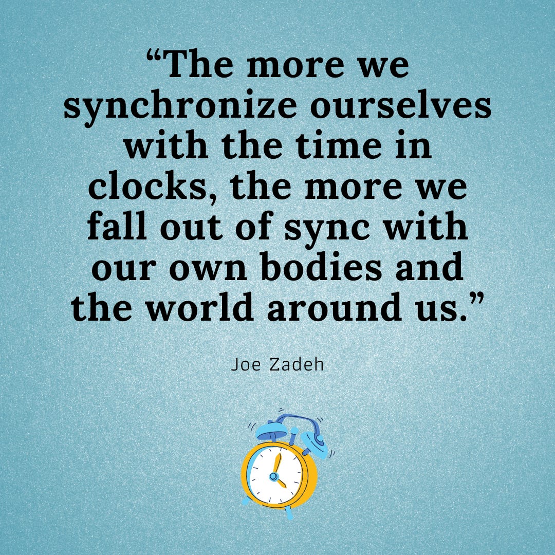 Granted, having a uniform time has allowed for much progress. We can better coordinate on small and grand scales and be specific about meetings and deadlines. In many ways, it was served humanity well. But as Zadeh notes, “The more we synchronize ourselves with the time in clocks, the more we fall out of sync with our own bodies and the world around us.”