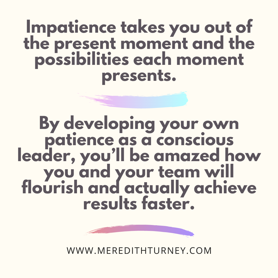 Research has shown that when leaders demonstrate patience with their teams, the team’s creativity increases by 16% and productivity by 13%. As a conscious leaders, your level of patience directly correlates with your team’s success. That’s a powerful reminder of how critical it is to continually develop your own self-awareness and growth, because it impacts everyone around you.