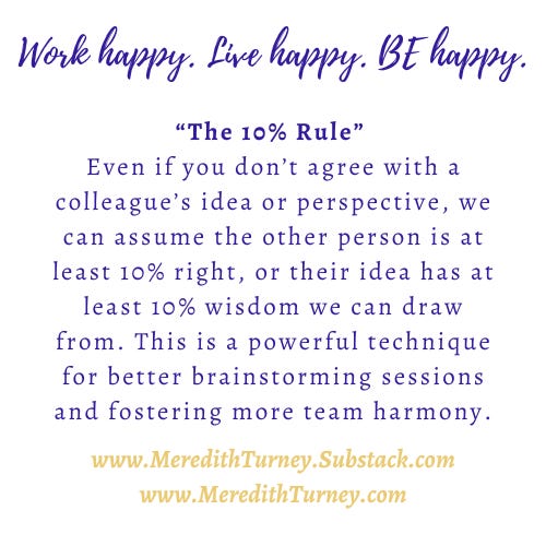 I recently learned another technique from Positive Intelligence author Shirzad Chamine that further enhances “Yes, and…” It’s called “The 10% Rule.” Even if you don’t agree with a colleague’s idea or perspective, we can assume the other person is at least 10% right, or their idea has at least 10% wisdom we can draw from. This is a powerful technique for better brainstorming sessions and fostering more team harmony.
