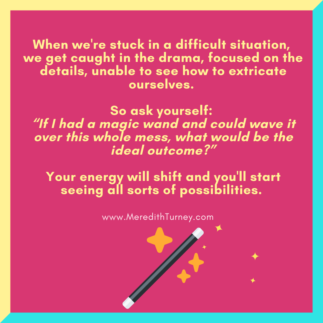 When someone being coached is describing a particularly difficult situation, they get caught in the drama, focused on the details, and unable to see how to extricate themselves. So I ask them, âIf you had a magic wand and you could wave it over this whole mess, what would be the ideal outcome for you?â