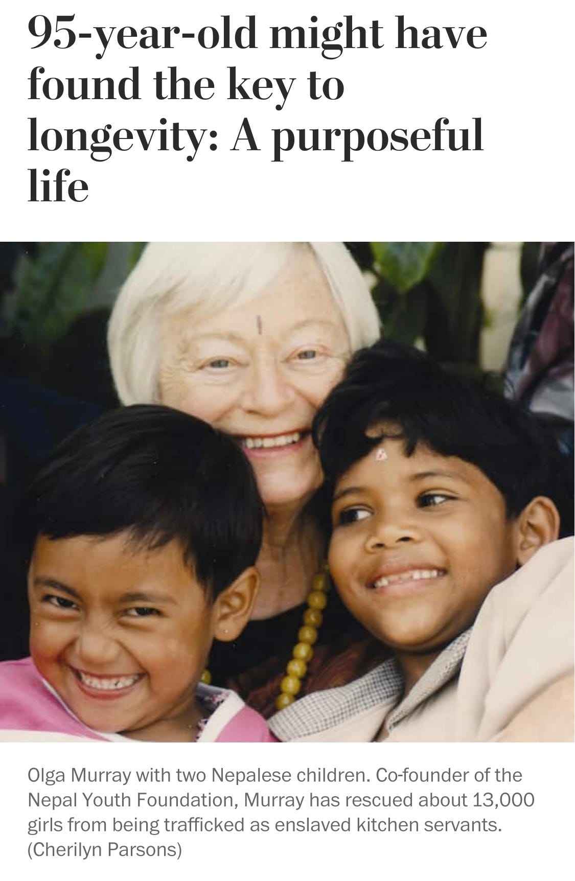 The Washington Post recently profiled a 95-year-old woman who shared her secret to longevity and happiness: a purposeful life. There aren’t many people her age who travel the world saving lives, but that’s exactly what Olga Murray does. Murray founded a nonprofit to help educate poor Nepalese children and save them from a life of slavery.
